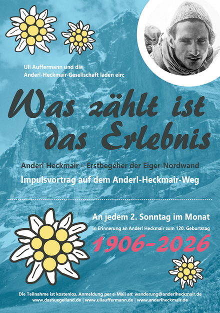 In Erinnerung an Anderl Heckmair führt Autor und Alpinjournalist Uli Auffermann interessierte Besucher/innen über den Anderl-Heckmair-Weg und gibt einen spannenden Einblick in das Leben Heckmairs, in die Besteigungsgeschichte der Eiger-Nordwand und vieles mehr.